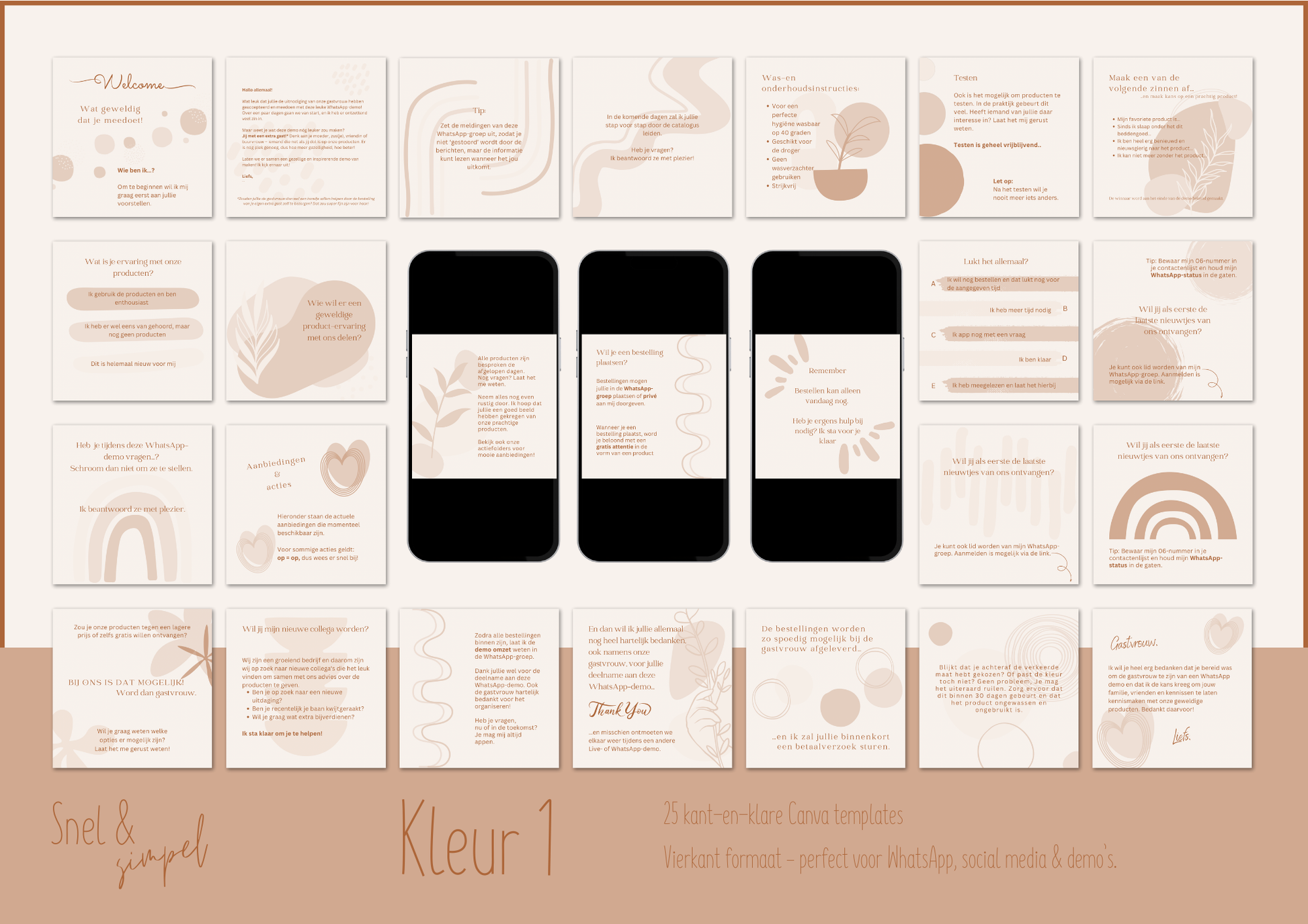Gebruik deze templates als basis voor jouw WhatsApp-demo en vervang jouw teksten door deze afbeeldingen. Zo creëer je eenvoudig een professionele, consistente uitstraling – zonder dat je alles zelf hoeft te maken.